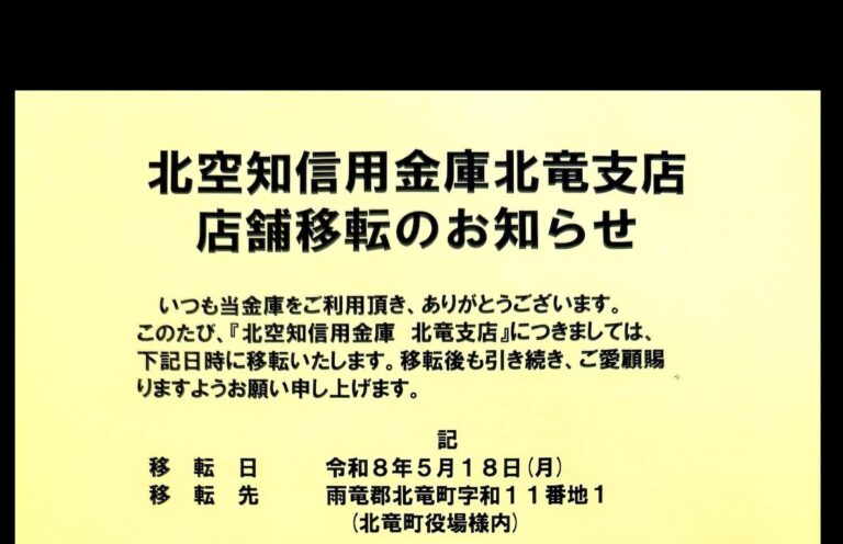 2026年4月28日(火) 北空知信用金庫 北竜支店 店舗移転のお知らせ いつも当金庫をご利用頂き、ありがとうございます。 このたび、『北空知信用金庫 北竜支店』につきましては、下記日時に移転いたしま […]