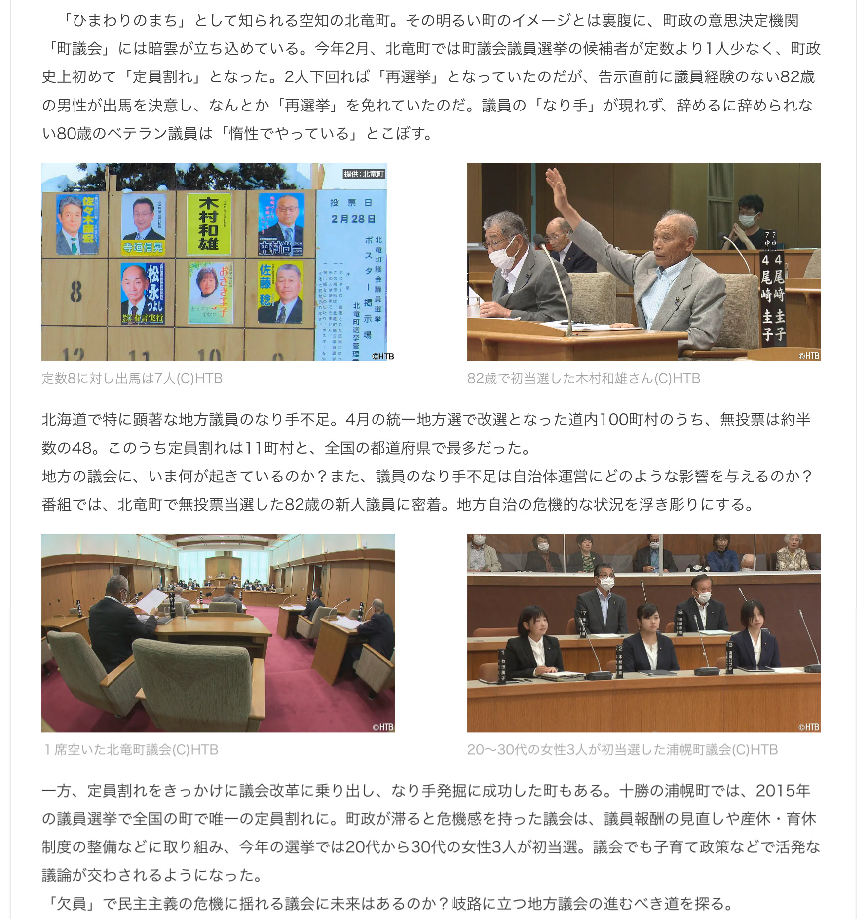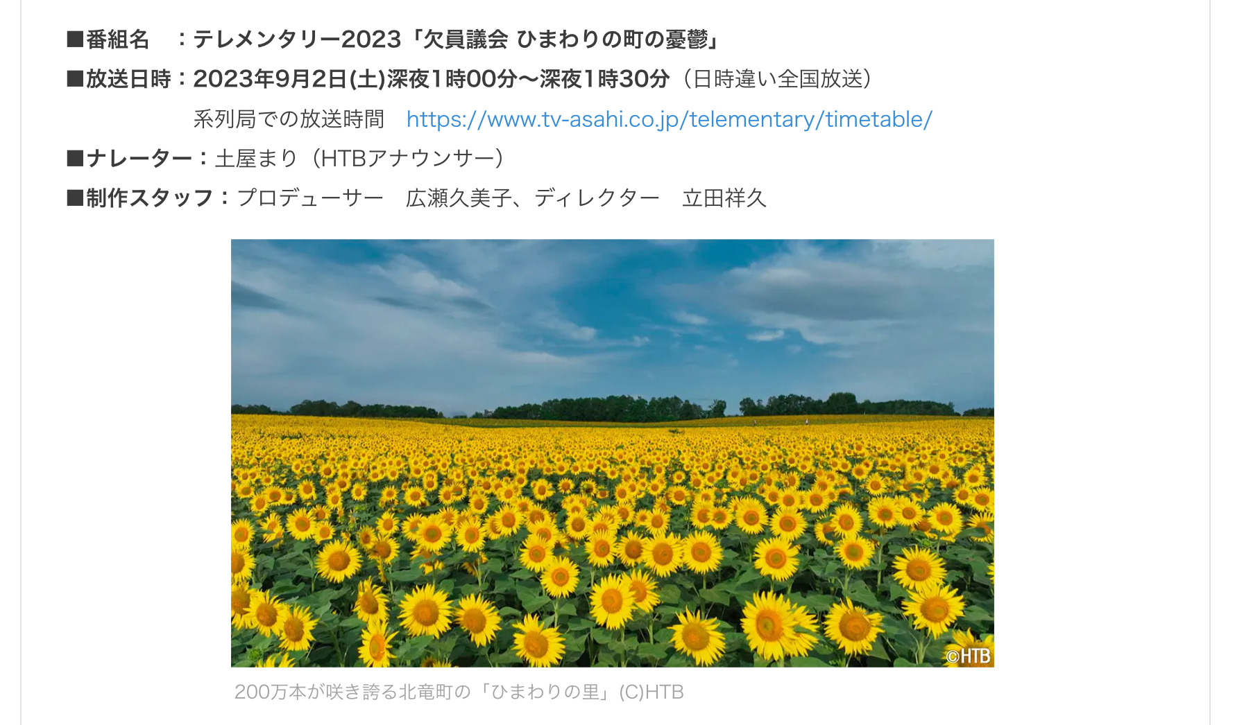 【引用】HTB北海道テレビは、9月2日(土)深夜1時から、テレメンタリー2023「欠員議会 ひまわりの町の憂鬱」を放送します。議員が欠けた「ひまわりのまち」。危機に立ち上がったのは82歳の新人議員。なり手不足はピンチ?それとも…
