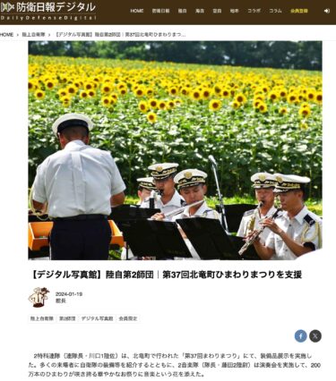 有限会社防衛日報社(東京都)が運営するインターネットサイト【防衛日報デジタル】に、「【デジタル写真館】陸自第2師団|第37回北竜町ひまわりまつりを支援」の記事(1月19日付け)が掲載されていますので、ご紹介いたします。