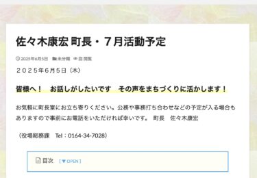 お気軽に町長室にお立ち寄りください。公務や事務打ち合わせなどの予定が入る場合もありますので事前にお電話をいただければ幸いです。 町長 佐々木康宏
