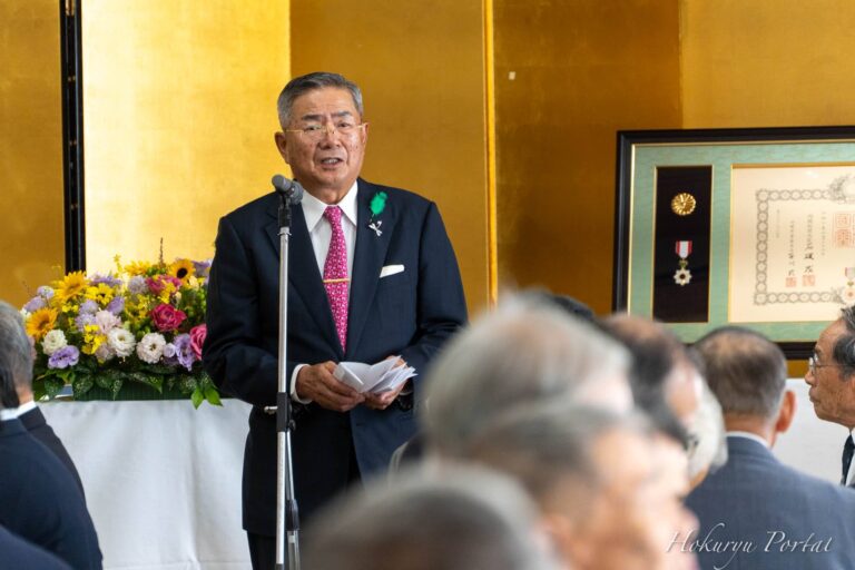 北海道北竜町で、長年にわたり地域の発展に尽くしてこられた前田博之氏(88歳)の旭日単光章受章祝賀会が、10月3日(金)、サンフラワーパーク北竜温泉にて盛大に開催されました。