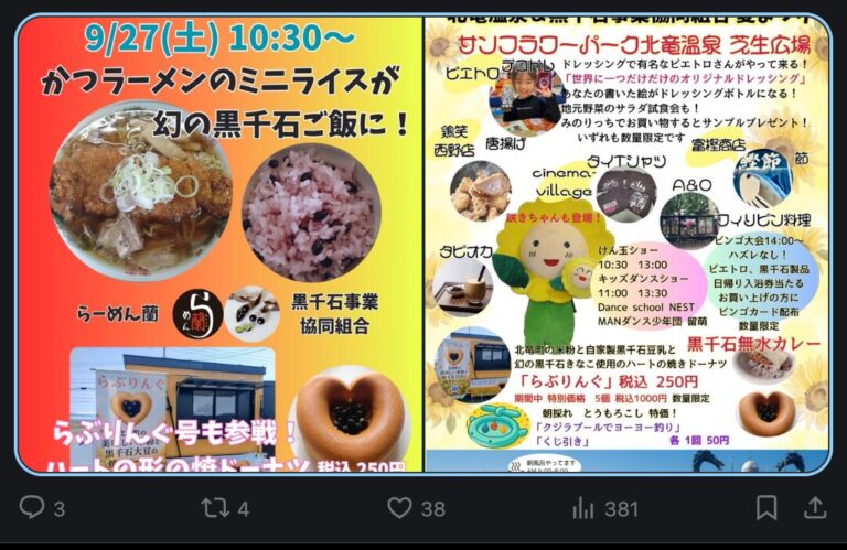 2025年7月30日(水) 7/30(水)おは黒千石ジャー!じゃーん!大好評だったんでやっちゃいます!8/9(土)北竜温泉&黒千石夏祭り8/20(水)21(木)チカホ8/23(土)24(日)札幌ドーム […]