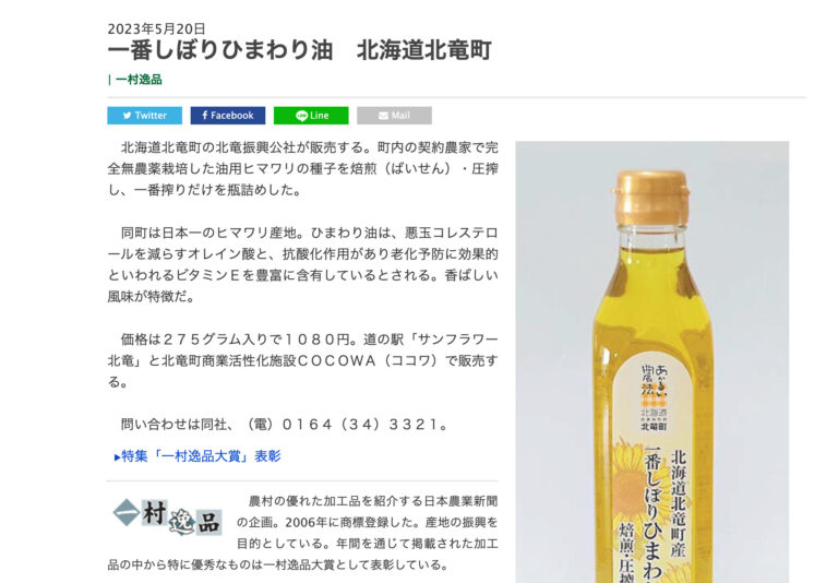 2023年5月22日(月) 日本農業新聞(東京都)が運営するインターネットサイト「日本農業新聞」に、「一番しぼりひまわり油 北海道北竜町」の記事(5月20日付け)が掲載されましたので、ご紹介いたします […]