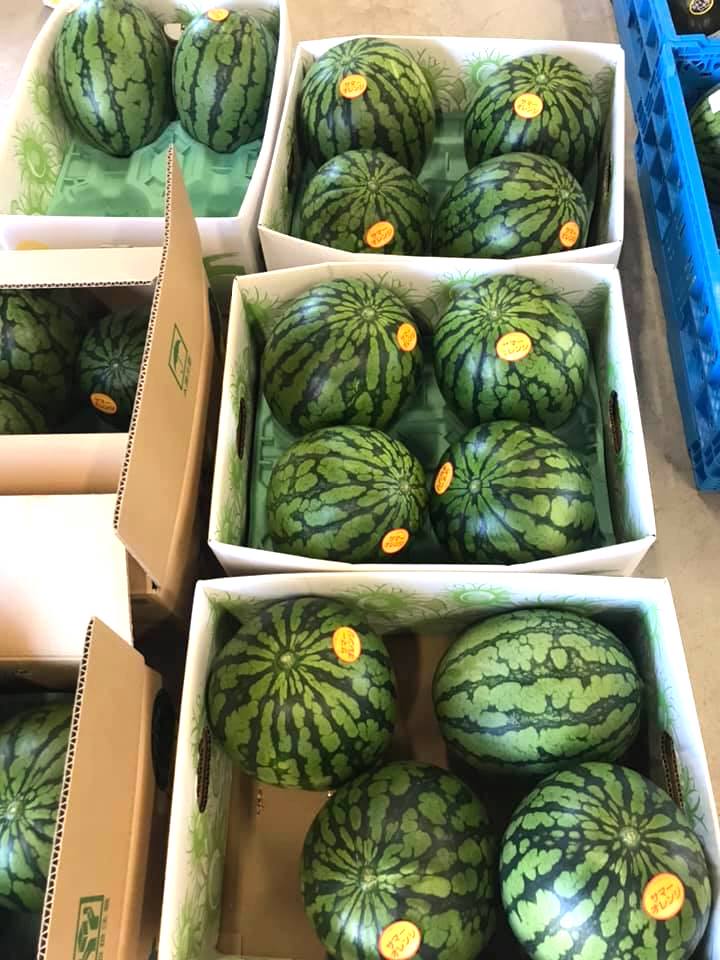 サマーオレンジの西瓜 🍉 黒皮の大玉西瓜、縞王の西瓜、黒皮小玉の太陽と月の西瓜、マダーボールの西瓜、ひまわり西瓜 🌻🌻🍉🌻🍉 と色々揃いました【みのりっち北竜】