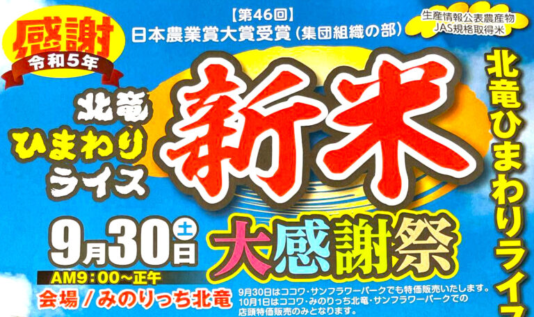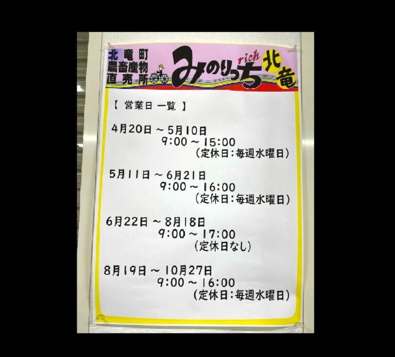 2024年5月1日(水) ❂ 4月20日(土)みのりっち北竜・プレオープン 4月20日(土)〜5月10日(金) 09:00〜15:00(定休日:毎週水曜日) ❂ 5月11日(土)みのりっち北竜・グラン […]