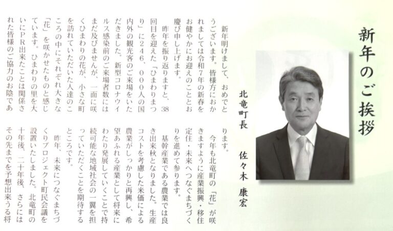 2025年1月1日(祝) 年頭のご挨拶 北竜町長 佐々木康宏 メッセージ 新年明けまして、おめでとうございます。皆様方におかれましては令和7年の新春をお健やかにお迎えのこととお慶び申し上げます。 昨年 […]