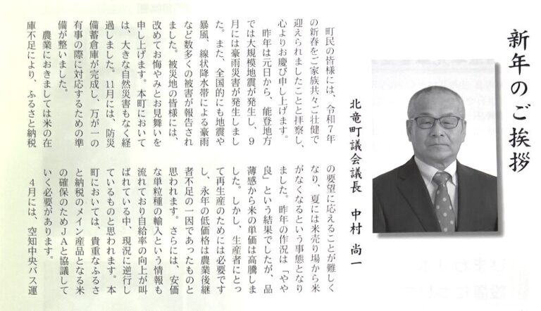 2025年1月1日(祝) 年頭のご挨拶 北竜町議会議長 中村尚一 メッセージ 町民の皆様には、令和7年の新春をご家族共々ご壮健で迎えられましたことと拝察し、心よりお慶び申し上げます。 昨年は元日から、 […]
