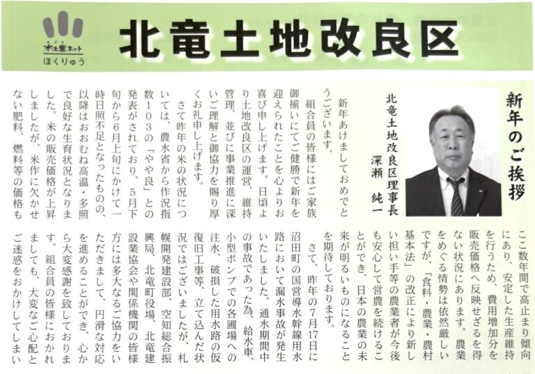 2025年1月1日(祝) 年頭のご挨拶 北竜土地改良区理事長 深瀬純一 メッセージ 新年あけましておめでとうございます。 組合員の皆様にはご家族御揃いにてご健勝で新年を迎えられたことを心よりお喜び申し […]