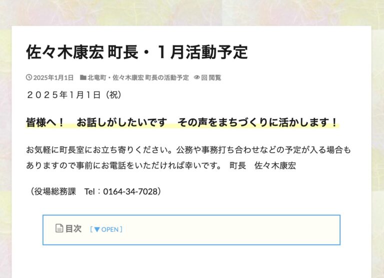 2025年1月1日(祝) 皆様へ! お話しがしたいです その声をまちづくりに活かします! お気軽に町長室にお立ち寄りください。公務や事務打ち合わせなどの予定が入る場合もありますので事前にお電話をいただ […]