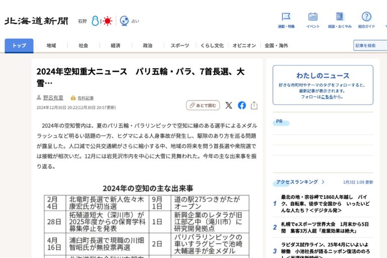 2025年1月6日(月) 北海道新聞社(札幌市)が運営するインターネットサイト【北海道新聞デジタル】に、「2024年空知重大ニュース パリ五輪・パラ、7首長選、大雪…」の記事(12月30日付け)が掲載 […]