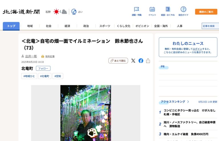 2025年8月25日(月) 北海道新聞社(札幌市)が運営するインターネットサイト【北海道新聞デジタル】に、「<北竜>自宅の畑一面でイルミネーション 鈴木節也さん(73)」の記事(8月23日付け)が掲載 […]