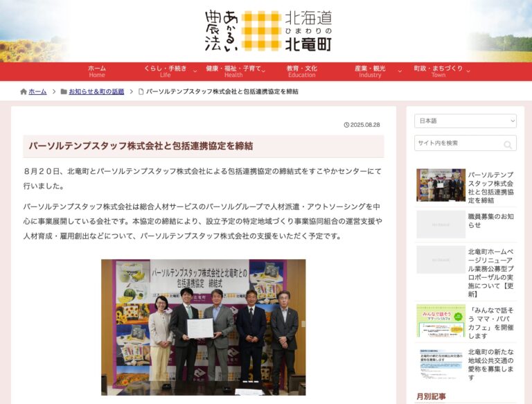2025年8月24日(日) 8月20日(水)、北竜町は人材サービスのパイオニア「パーソルテンプスタッフ株式会社」と包括連携協定を締結しました。町の深刻な人材不足という課題に対し、同社の専門的な知見を活 […]