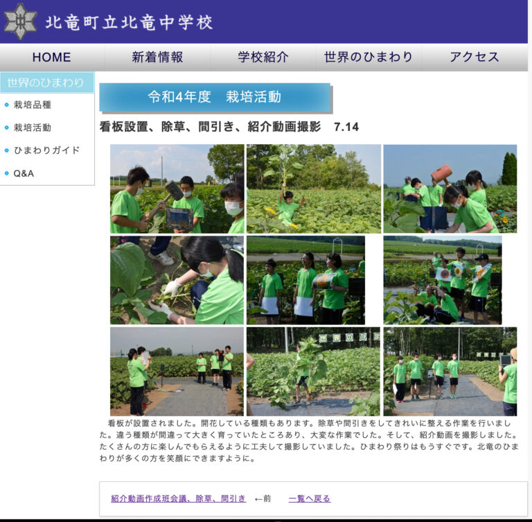 2022年7月19日(火) 北竜中学校生徒による世界のひまわりガイドが、7月26日(火)11:00~15:00に行われます。ひまわりガイドに先立ち、素晴らしい紹介動画8本が制作されました。ご紹介いたし […]