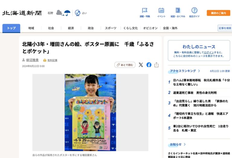 2024年8月22日(木) 北海道新聞社(札幌市)が運営するインターネットサイト【北海道新聞デジタル】に、「北陽小3年・増田さんの絵、ポスター原画に 千歳『ふるさとポケット』」の記事(8月22日付け) […]