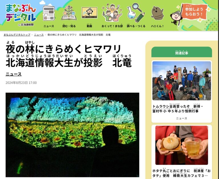 2024年8月26日(月) 北海道新聞社(札幌市)が運営するインターネットサイト・道新こども新聞まなぶんのウェブ版【まなぶんデジタル】に、「夜の林にきらめくヒマワリ 北海道情報大生が投影 北竜」の記事 […]