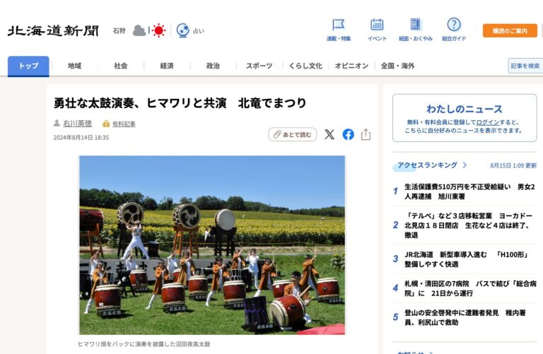 2024年8月15日(木) 北海道新聞社(札幌市)が運営するインターネットサイト【北海道新聞デジタル】に、「勇壮な太鼓演奏、ヒマワリと共演 北竜でまつり」の記事(8月14日付け)が掲載されていますので […]