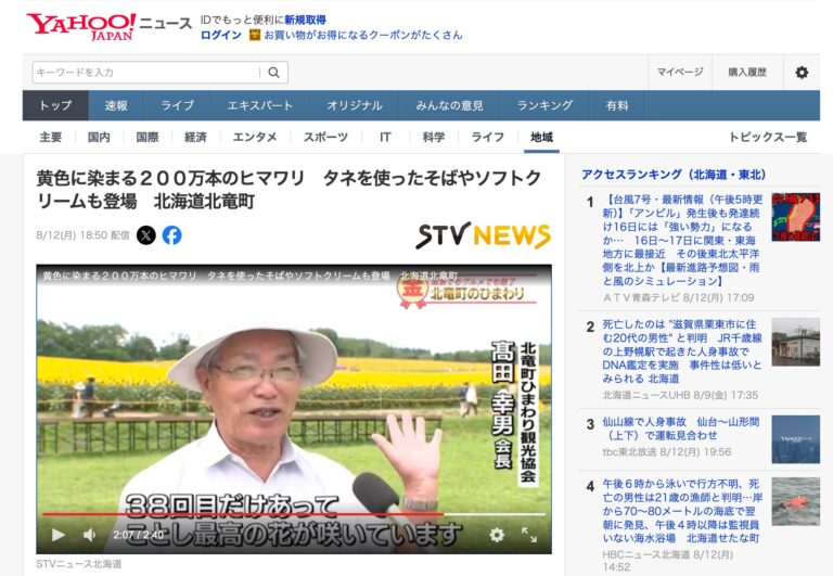2024年8月13日(火) ヤフー株式会社(東京都)が運営するインターネットサイト【Yahoo!ニュース】に、「黄色に染まる200万本のヒマワリ タネを使ったそばやソフトクリームも登場 北海道北竜町【 […]