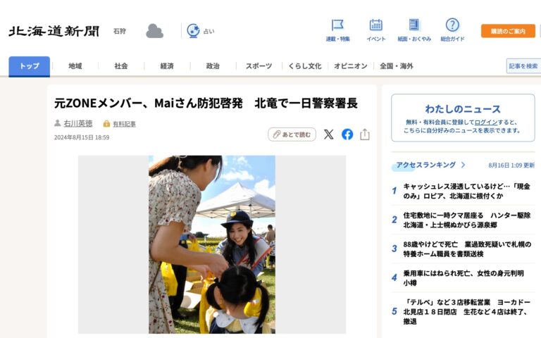 2024年8月19日(月) 北空知新聞社(深川市)が運営するインターネットサイト【北空知新聞】に、「『ZONE』の元メンバー・Maiさんが深川署の一日署長に 北竜『ひまわりまつり』会場で啓発活動」の記 […]