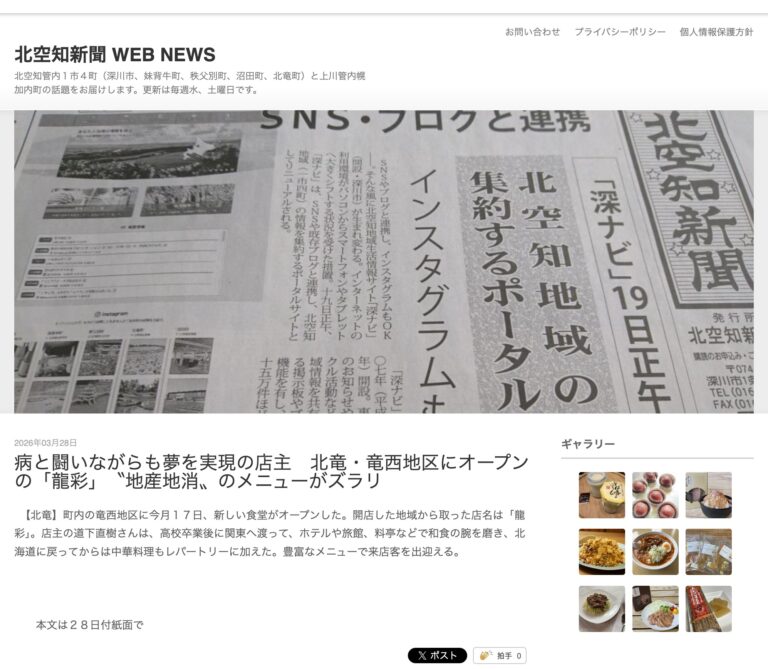 2026年3月18日(水) 北海道新聞社(札幌市)が運営するインターネットサイト【北海道新聞デジタル】に、「北竜に新名店、空白地帯に「龍彩」オープン 和食・中華で胃袋つかむ」の記事(3月17日付け)が […]