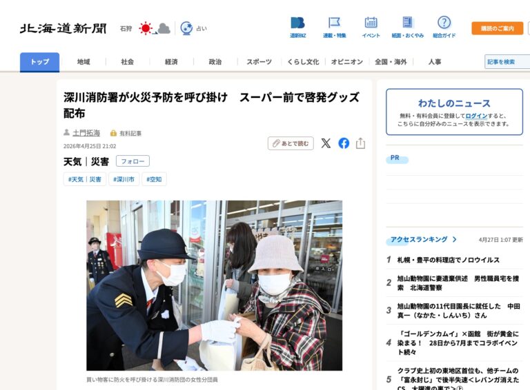 2026年4月27日(月) 北海道新聞社(札幌市)が運営するインターネットサイト【北海道新聞デジタル】に、「深川消防署が火災予防を呼び掛け スーパー前で啓発グッズ配布」の記事(4月25日更新)が掲載さ […]