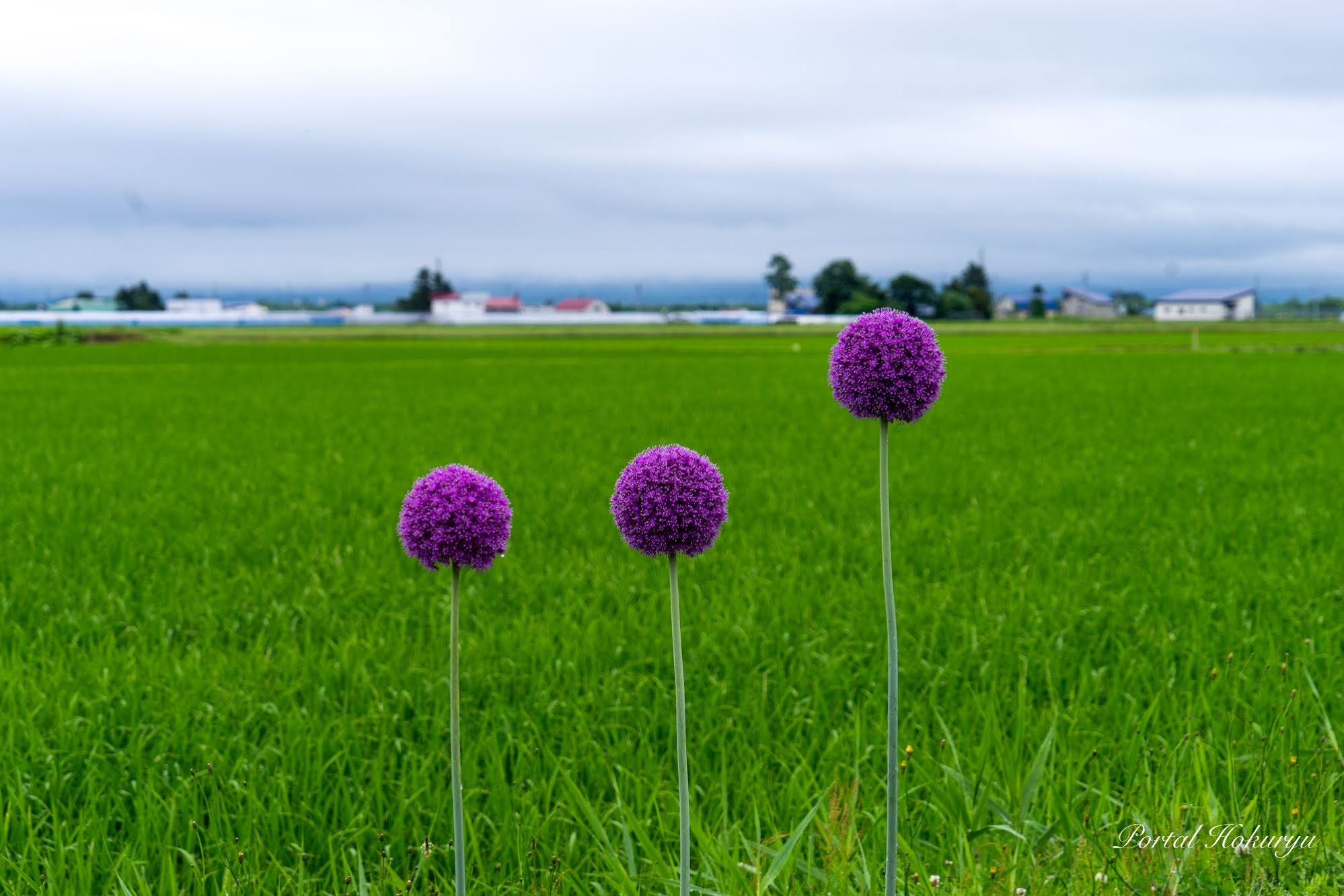 2020年6月29日(月) 初々しい黄緑の水田をバックに、丸いボール状の紫の花「ギガンチウム」。。。 モダンアートのよう存在感のある素敵な花です。  ◇ noboru & ikuko