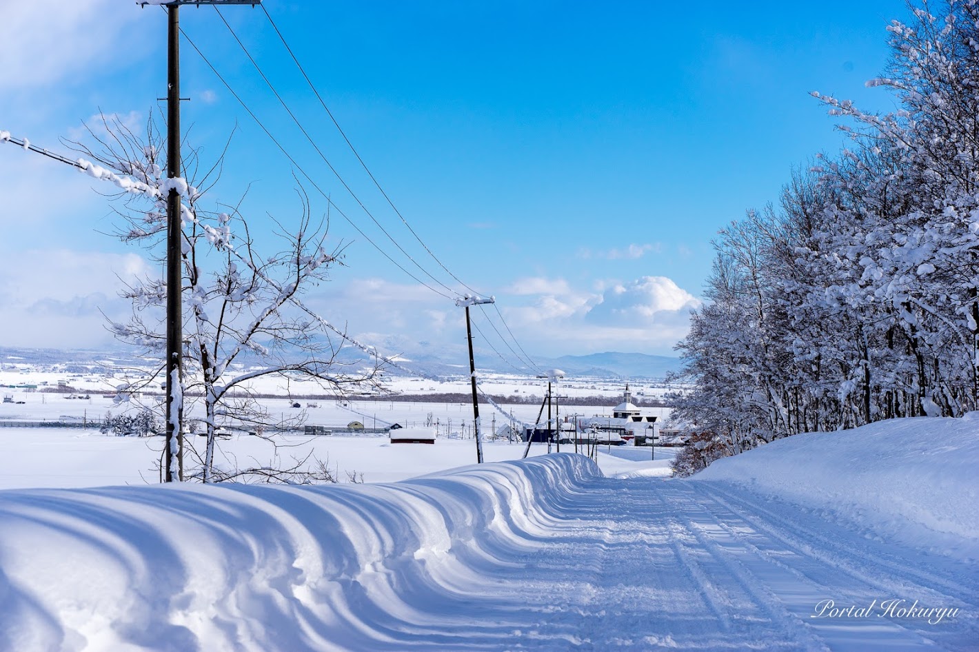 2021年1月7日(木) 眺望の丘へ続く雪道。。。 樹木のシルエットのしましま模様が、雪道に描かれて、ユニークなアート空間が広がる風景です。 ◇ noboru & ikuko