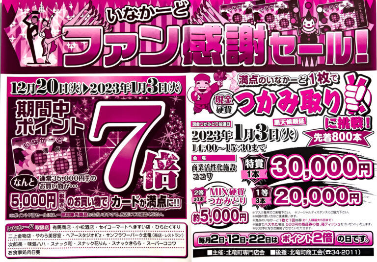 (お知らせ)いなかーどファン感謝セール!ポイント7倍:12月20日〜2023年1月3日【北竜町専門店会】