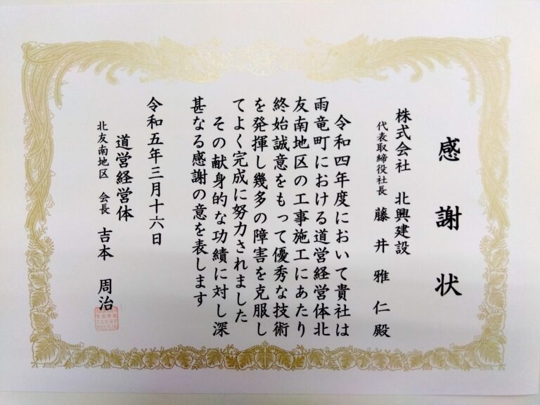 北友南地区促進期成会・吉本会長様より感謝状を頂戴致しました。日頃より現場担当職員への温かいお声掛けを頂き労働環境の向上にもお気遣い頂きました事を感謝申し上げます【北興建設】