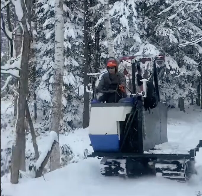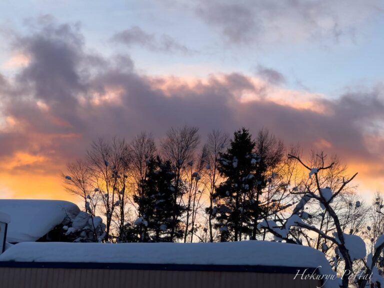 雪雲を橙色に染める夕陽
