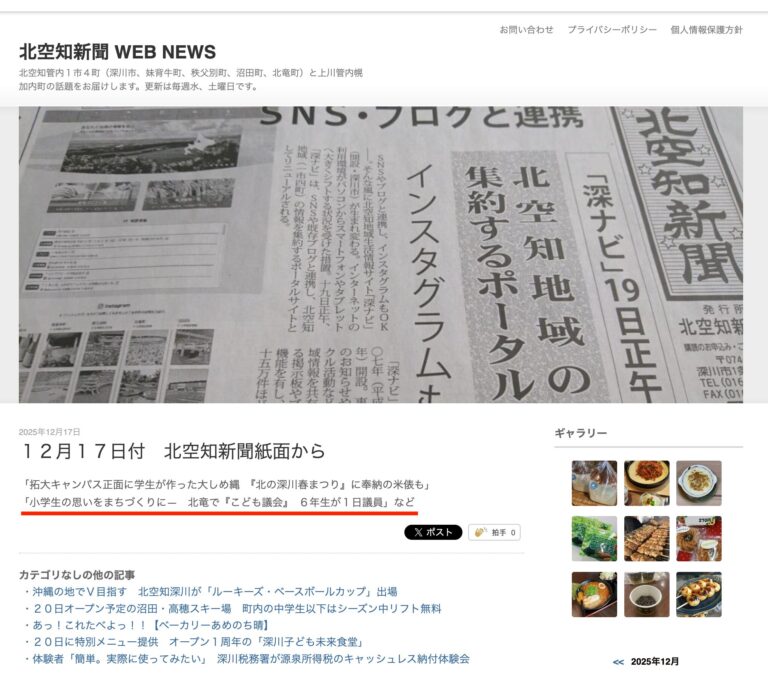 2025年12月17日(水) 北空知新聞社(深川市)が運営するインターネットサイト【北空知新聞】に、「小学生の思いをまちづくりに― 北竜で『こども議会』 6年生が1日議員」の記事(12月17日付け)が […]