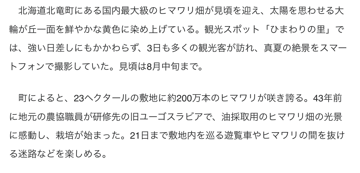 一般社団法人共同通信社ホームページ、及びYoutubeチャンネル『KyodoNews』に、北竜町ひまわりの里の記事「真夏咲く日輪、丘を染め 国内最大級ヒマワリ畑」が掲載されましたので、ご紹介いたします。