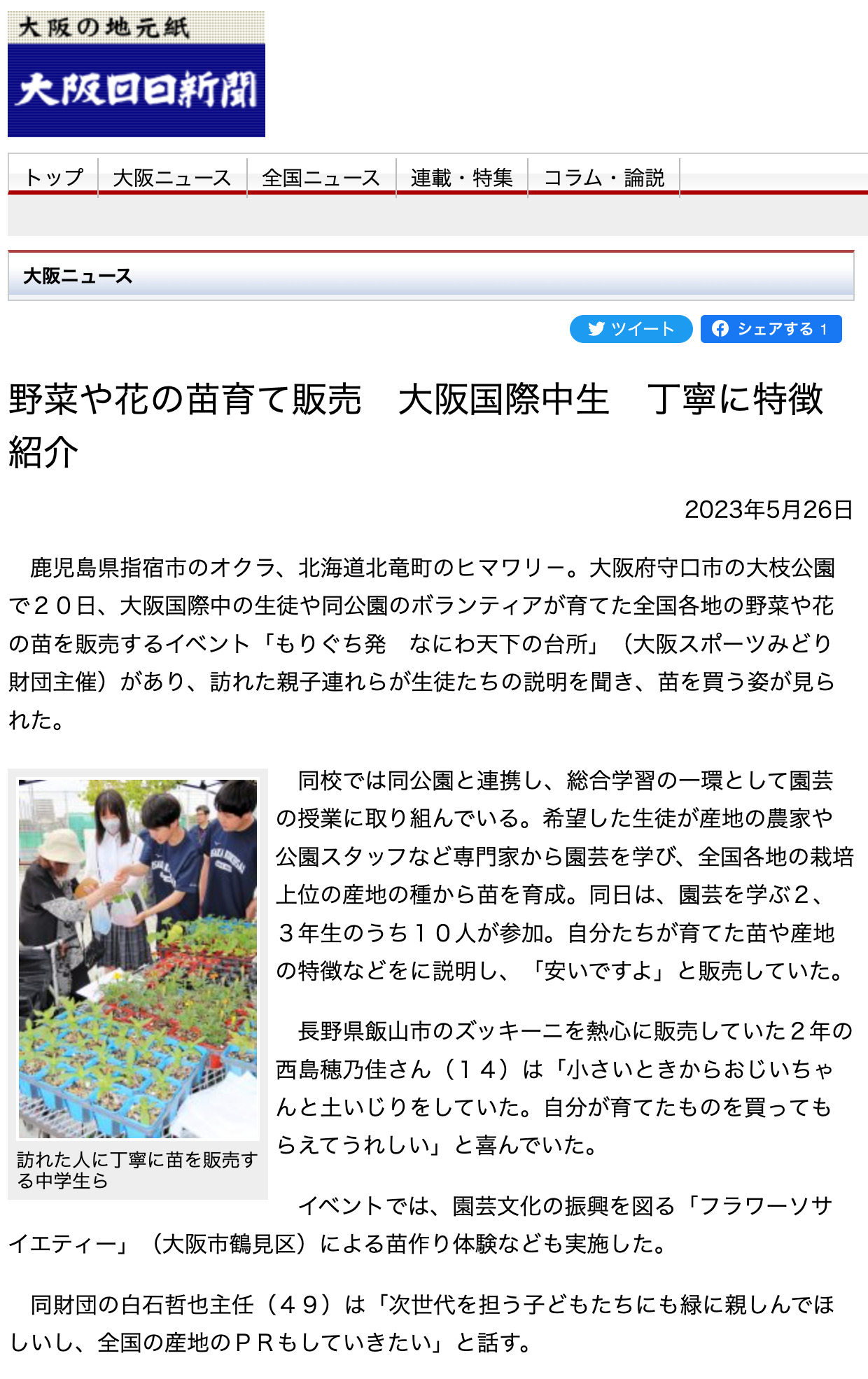 (株)新日本海新聞社(大阪府)が運営するインターネットサイト「大阪日日新聞」の「野菜や花の苗育て販売 大阪国際中生 丁寧に特徴紹介」記事(5月26日付け)内にて北竜町のひまわりが紹介されましたので、ご紹介いたします。