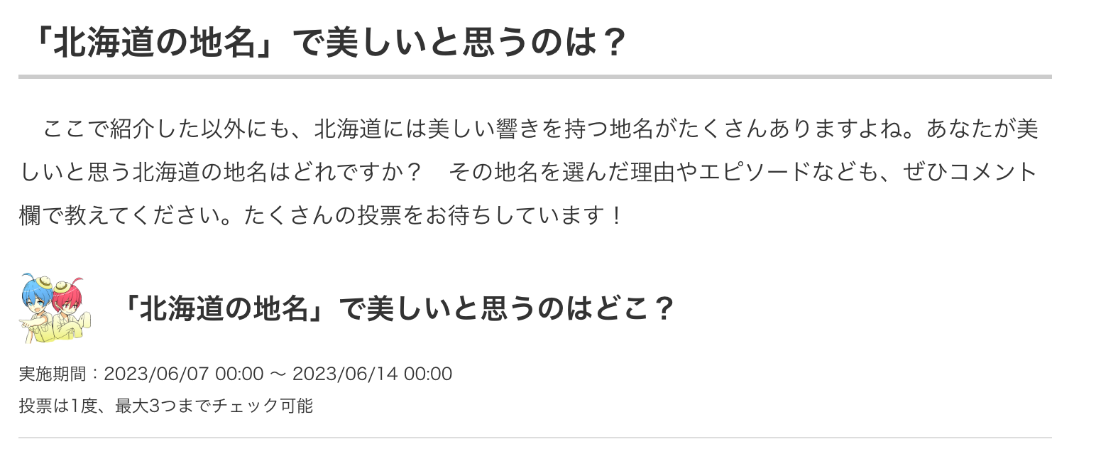 アイティメディア株式会社 (英文表記:ITmedia Inc.・東京都)が運営するインターネットサイト『ねとらぼ調査隊』にて、「『北海道の地名』で美しいと思うのはどこ?【人気投票実施中】」が実施されています。