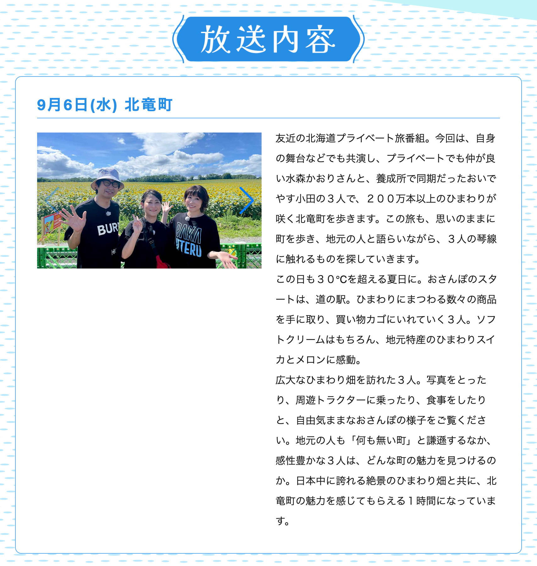 北海道放送HBC(札幌市)のバラエティ番組「おさんぽ北海道〜この旅はお世話になります〜」にて、9月6日(水)19:00〜北竜町の訪問の様子が放送されます。