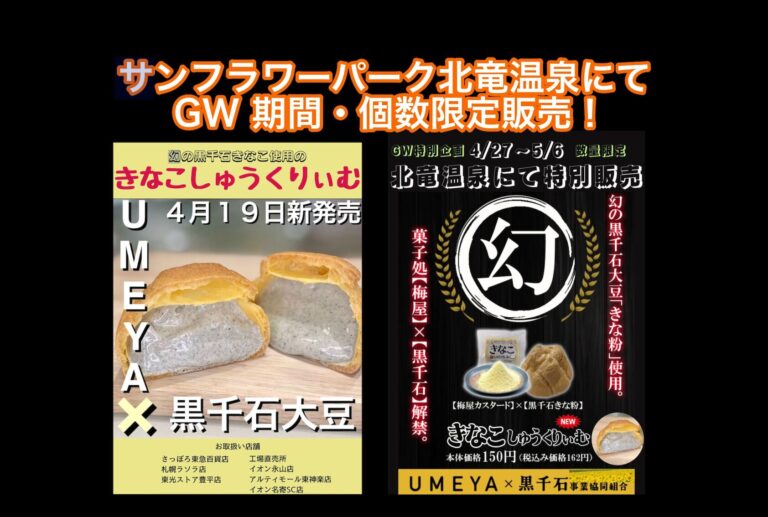 4月19日(金)UMEYA × 黒千石大豆コラボ🔥!!「黒千石きなこしゅうくりぃむ」販売いたします!【サンフラワーパーク…