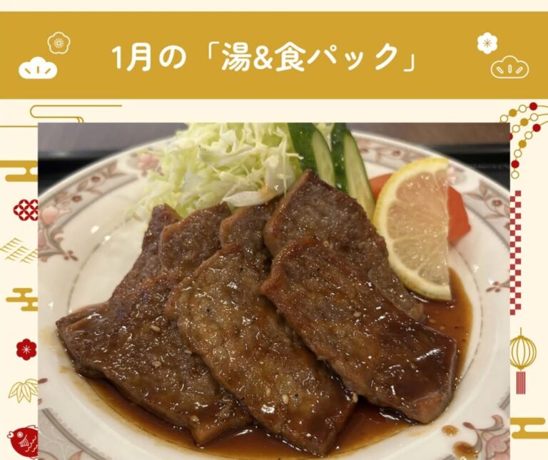 January's "Hot Spring & Food Pack" offers a "Beef Cut Steak Set Meal" [Sunflower Park Hokuryu Onsen]
