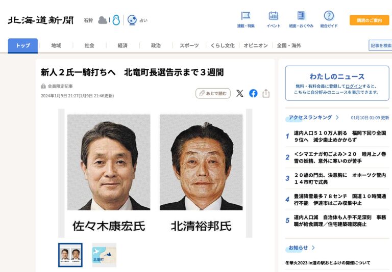 On Wednesday, January 10, 2024, the Hokkaido Shimbun (Sapporo) website, Hokkaido Shimbun Digital, published an article titled "Hokuryu Town Council By-election: Three candidates elected without a vote" (dated January 9). We would like to share this with you. [...]