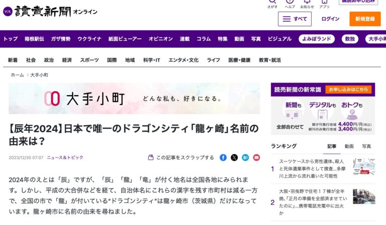 2024年1月1日(月) 読売新聞社(東京都)が運営するインターネットサイト「読売新聞オンライン」に「【辰年2024】日本で唯一のドラゴンシティ「龍ヶ崎」名前の由来は?」の記事(2023年12月30日 […]