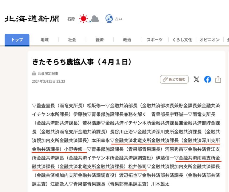 On Tuesday, March 26, 2024, the Hokkaido Shimbun (Sapporo) website, Hokkaido Shimbun Digital, published an article titled "Kitasorachi Agricultural Cooperative Personnel Changes (April 1st)" (dated March 25th). We would like to share it with you.