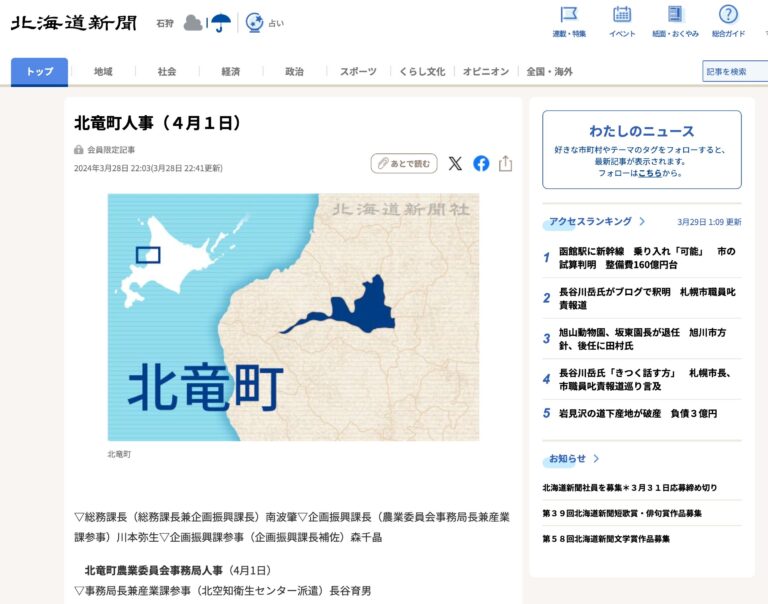 Friday, March 29, 2024: The Hokkaido Shimbun (Sapporo) website, Hokkaido Shimbun Digital, has published an article titled "Hokuryu Town Personnel Changes (April 1st)" (dated March 28th), which we would like to share with you. [...]
