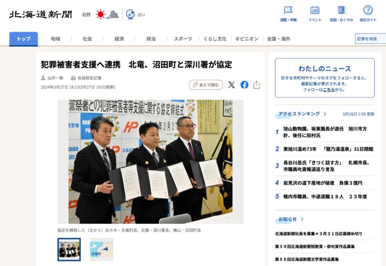 On Thursday, March 28, 2024, the Hokkaido Shimbun (Sapporo) website, Hokkaido Shimbun Digital, published an article titled "Hokuryu, Numata Town, and Fukagawa Police Station Sign Agreement to Collaborate on Crime Victim Support" (dated March 27).