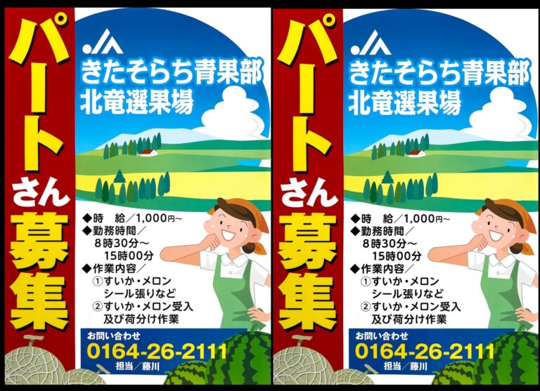 2024年3月21日(木) パートさん募集 🍈 時給 1,000円〜 勤務時間 08:30〜15:00 作業内容 ① すいか・メロン シール貼りなど ② すいか・メロン受 […]
