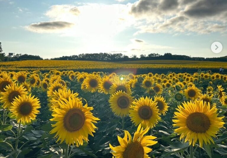 昨日(8/1)の夕方に撮影しました 🌻 手前の方はほぼ満開です!!ひまわりの里で販売している 手作りのがま口大人気です!!ひまわりの柄や他にも色々ありますよ ♡ お土産にもぴったりです👛【お食事処向日葵】