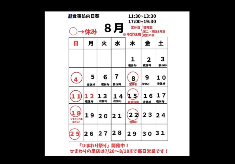 8月の営業日です!ひまわりの里の間は夜はお休みです。⚠️急遽お休みもあると思います。。ひまわりの里は18日まで毎日営業しています🌻【お食事処向日葵】