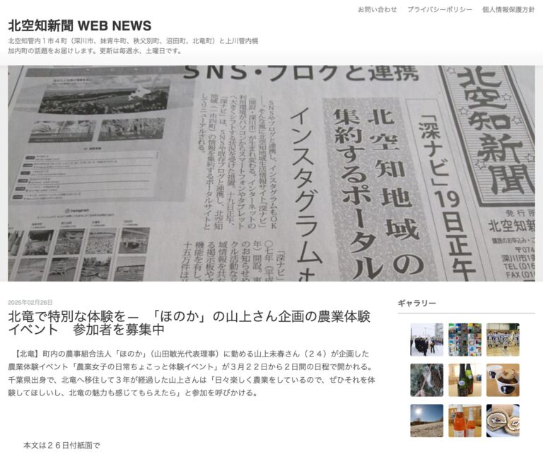2025年2月27日(木) 北空知新聞社(深川市)が運営するインターネットサイト【北空知新聞】に、「北竜で特別な体験を― 『ほのか』の山上さん企画の農業体験イベント 参加者を募集中」の記事(2月26日 […]