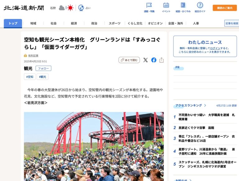2025年4月28日(月) 北海道新聞社(札幌市)が運営するインターネットサイト【北海道新聞デジタル】に、「空知も観光シーズン本格化 グリーンランドは「すみっコぐらし」「仮面ライダーガヴ」」の記事(4 […]