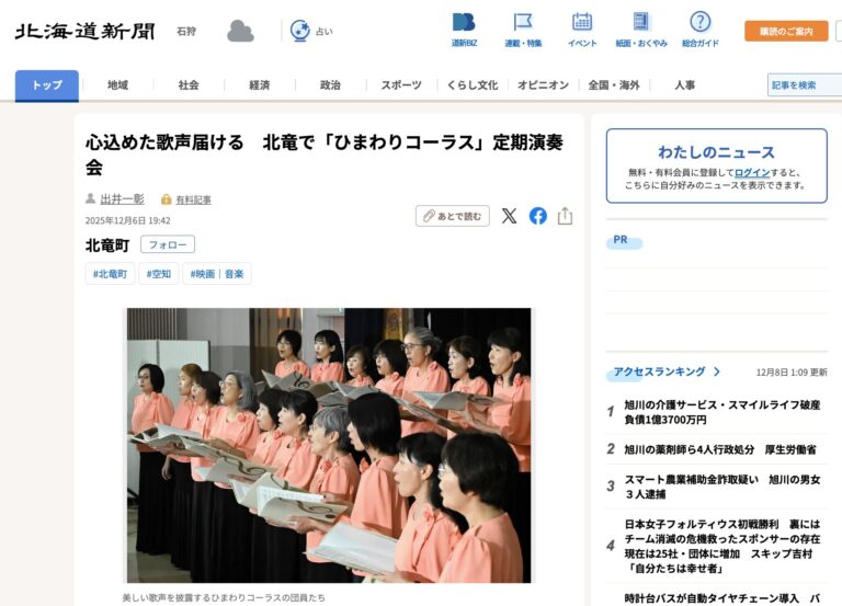 El lunes 8 de diciembre de 2025, se publicó un artículo titulado "Cantos conmovedores en el concierto regular del 'Coro Himawari' en Hokuryu" en el sitio web digital Hokkaido Shimbun, operado por Hokkaido Shimbun Press (ciudad de Sapporo). (8 de diciembre de 2025)