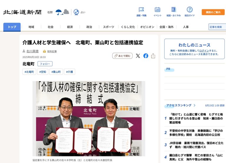 2025年8月19日(火) 北海道新聞社(札幌市)が運営するインターネットサイト【北海道新聞デジタル】に、「介護人材と学生確保へ 北竜町、栗山町と包括連携協定」の記事(8月18日付け)が掲載されていま […]