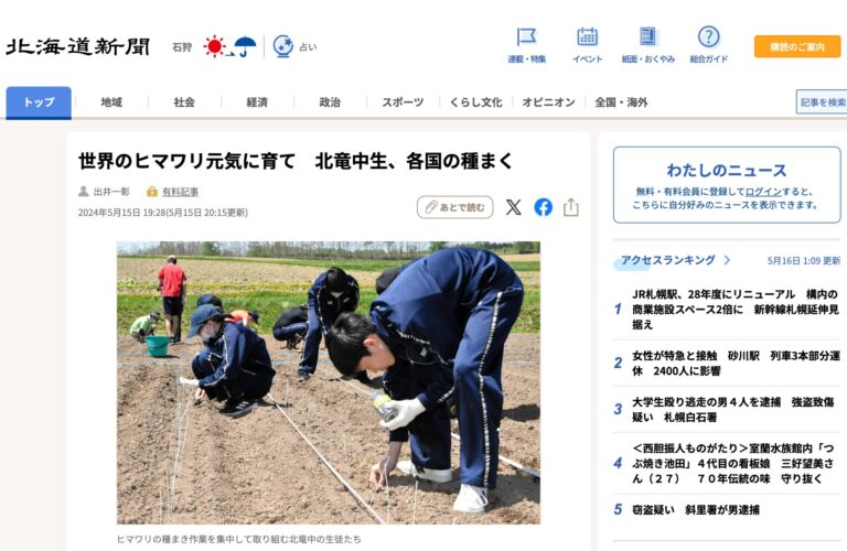 2024年5月16日(木) 北海道新聞社(札幌市)が運営するインタネットサイト【北海道新聞デジタル】に、「世界のヒマワリ元気に育て 北竜中生、各国の種まく」の記事(5月15日付け)が掲載されていますの […]