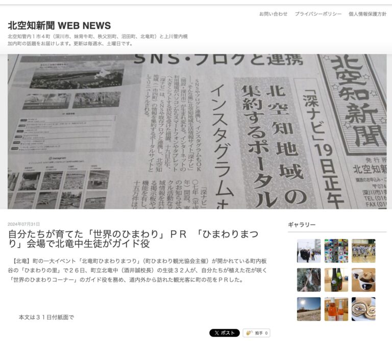 2024年8月1日(木) 北空知新聞社(深川市)が運営するインターネットサイト【北空知新聞】に、「自分たちが育てた「世界のひまわり」PR 「ひまわりまつり」会場で北竜中生徒がガイド役」の記事(7月31 […]